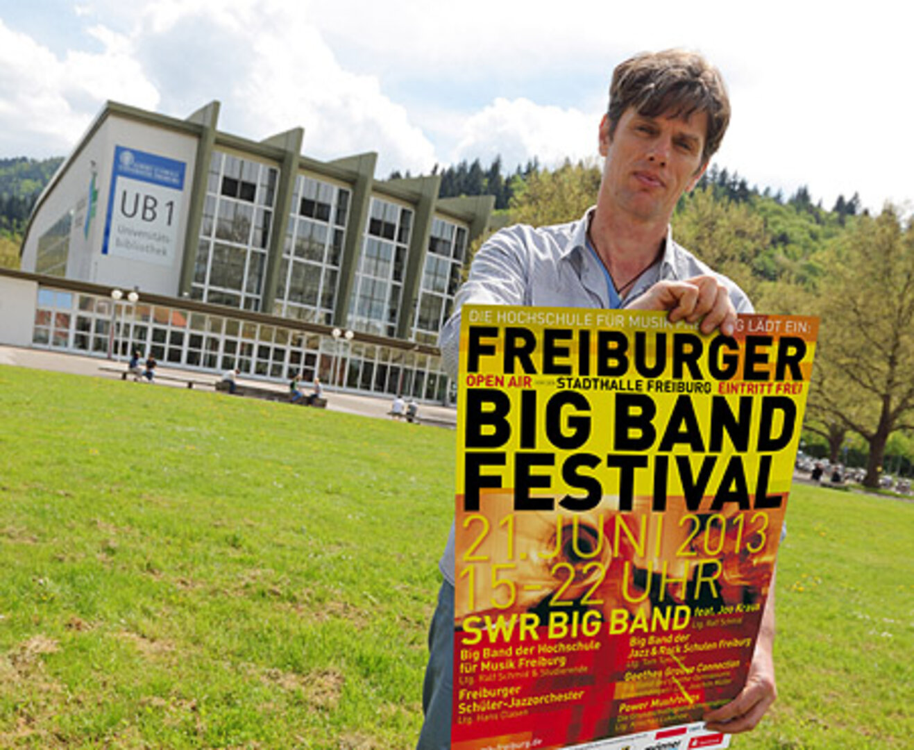 Ab 15 bis 22 Uhr werden auf einer Freiluftbühne vor der alten Stadthalle an der Schwarzwaldstraße (derzeit Unibibliothek UB1) sechs Big Bands aus der Region Freiburg auftreten.