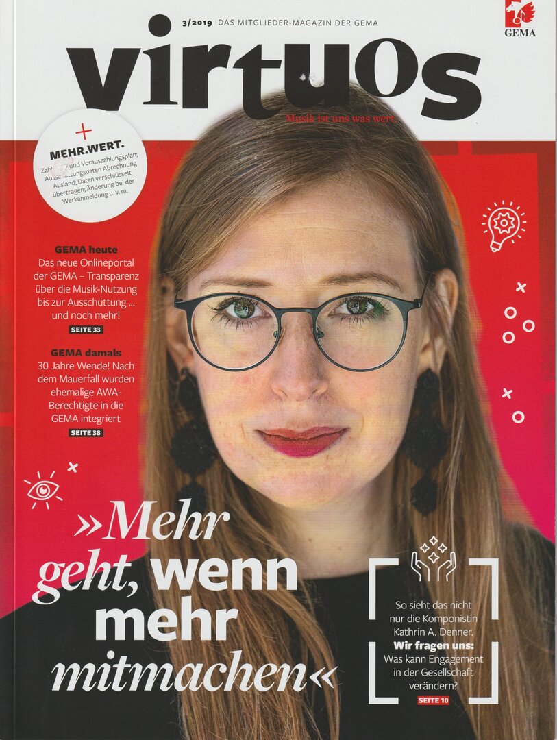 Auf dem Titelbild des aktuellen Gema-Magazins „virtuos“ erscheint Kathrin Denner, die in der Klasse Prof. Johannes Schöllhorn Komposition im Konzertexamen studiert. Bei „virtuos“ erzählt die engagierte Studentin von ihrem gesellschaftlichen Einsatz und ihrer Motivation. Hier kommen Sie zum Download des Magazins.