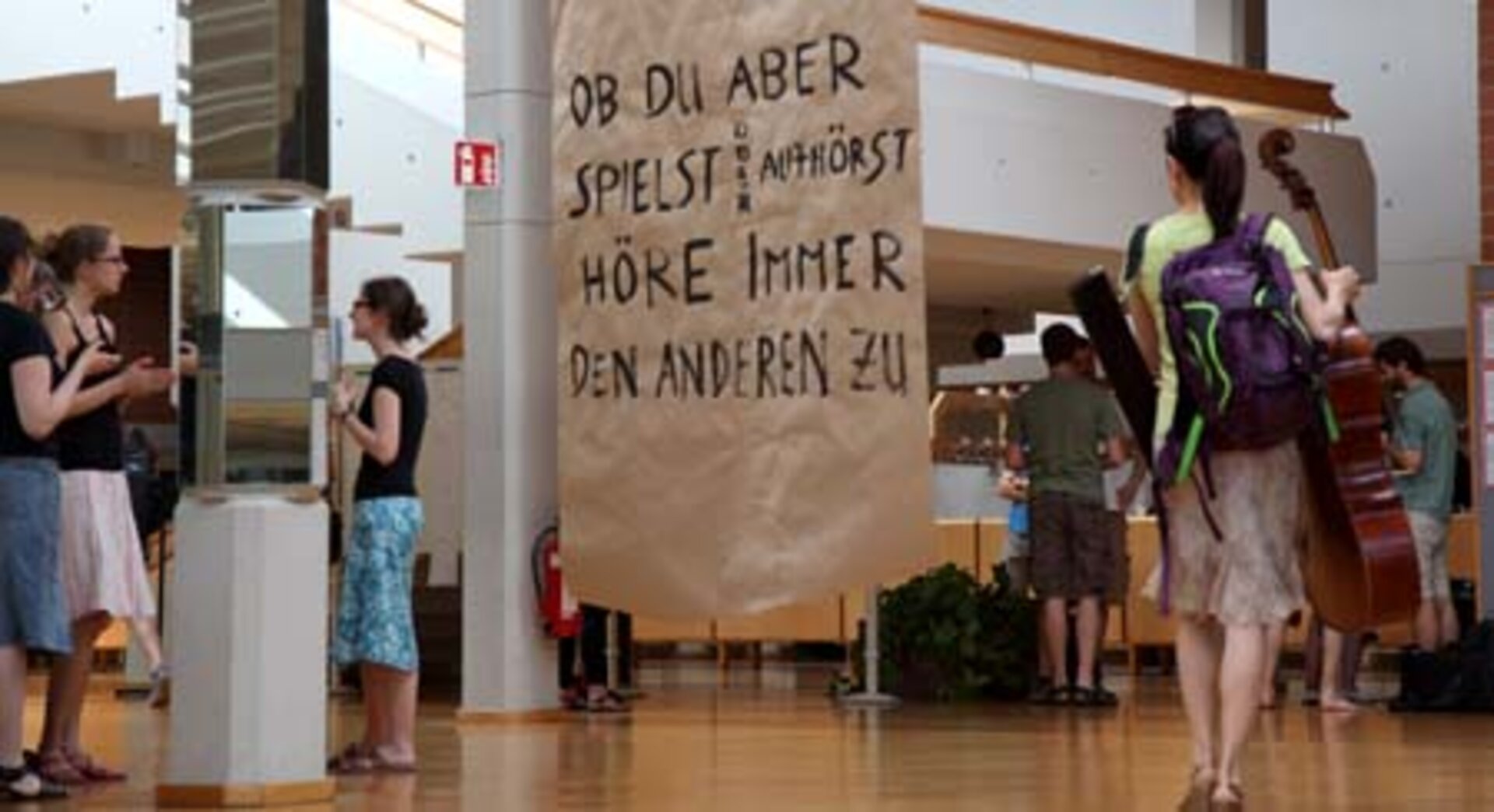 Auch in diesem Jahr gab es an der Hochschule für Musik Freiburg wieder die »Projekttage Improvisation«: Am 10. und 11. Juni wurde der Unterricht an der Hochschule ausgesetzt, stattdessen beteiligten sich Lehrende, Studierende und Gäste an Workshops zum musikalischen »freien Sprechen«, dem Improvisieren. Diese Form der Auseinandersetzung mit dem Thema ist ein Novum in der deutschen Musikhochschullandschaft.