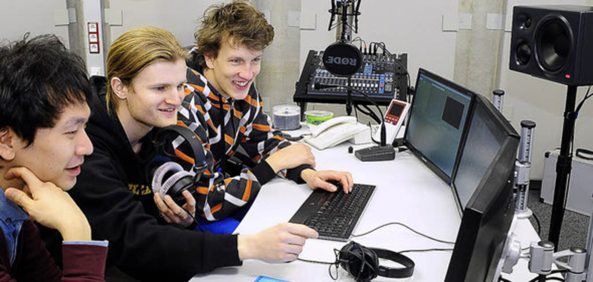 Carlo Phillip Thomsen (Mitte) im Studio für Filmmusik der Hochschule für Musik Freiburg. Foto: BZ, Thomas Kunz