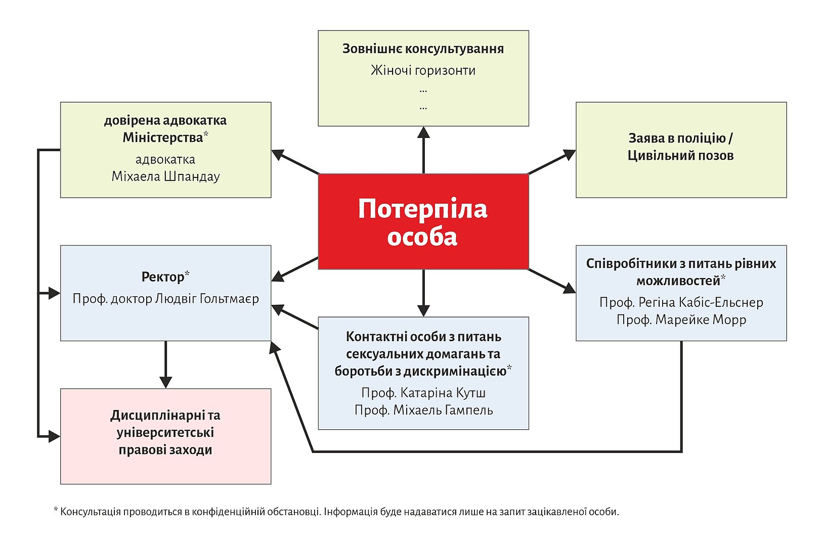 Уповноважений з питань рівних можливостей, контактні особи у випадку сексуальних домагань та антидискримінації, а також конфіденційний консультант мають можливість залучити ректора. Тільки ректор і Міністерство можуть ініціювати дисциплінарні та університетські заходи проти членів університету.