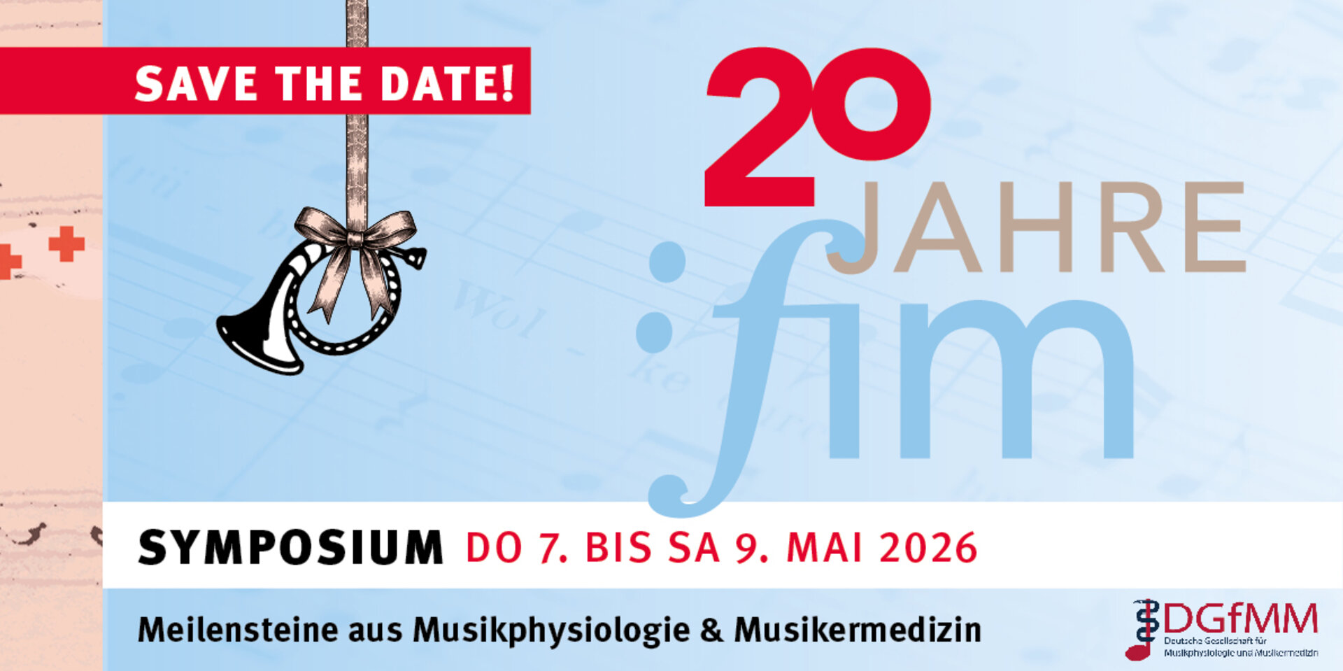 Im akademischen Jahr 2025-2026 feiert das Freiburger Institut für Musikermedizin (FIM) sein zwanzigjähriges Bestehen. Das feiern wir vom Donnerstag, 7. Mai bis Samstag, 9. Mai 2026 an der Hochschule für Musik Freiburg im Rahmen des 24. Symposiums der Deutschen Gesellschaft für Musikphysiologie & Musikermedizin (DGfMM). Hierzu laden wir Sie herzlich ein! Bitte reservieren Sie die Tage schon jetzt in Ihrem Jahreskalender 2026.